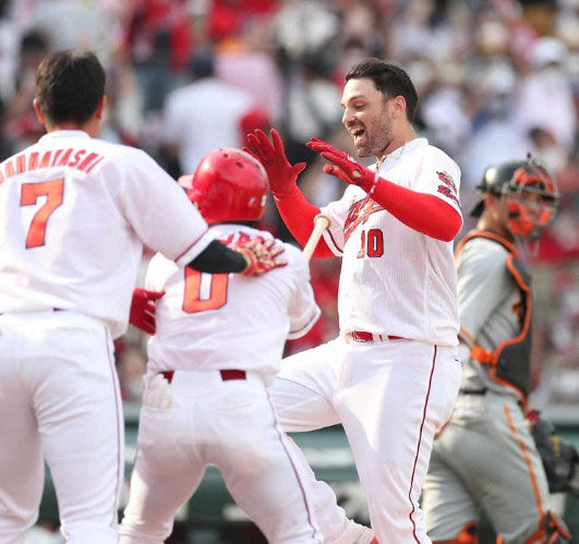 広島のライアン・マクブルーム内野手(30)が、2日の巨人戦で、来日初のサヨナラ本塁打で決着をつけた。お立ち台に呼ばれたヒーローは『グッジョブ!』とインタビュアーに振られ、「サンキュー、アツイ!」と一言。「キクが先頭で出てくれて、何か起こりそうな予感がしていた。自分がするか、坂倉がするか。チームメートを信じているので、任せようという気持ちで打席に入って、最高の結果になった」と喜んだ。