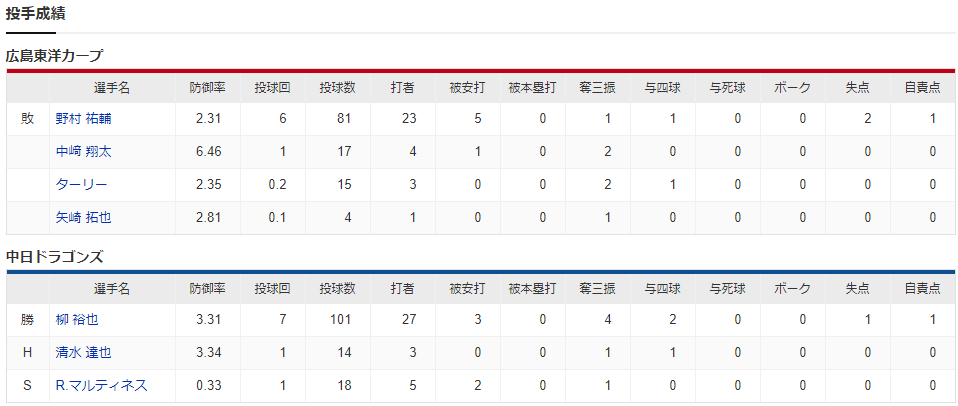 柳の明大の先輩でもある先発・野村は6回2失点。序盤にミスも絡んで、初回と2回にそれぞれ1失点。その後はテンポよく中日打線を抑えたが、618日ぶり白星をつかんだ6月10日の西武戦(ベルーナD)以来の先発マウンドで2勝目はならず、今季初黒星を喫した。