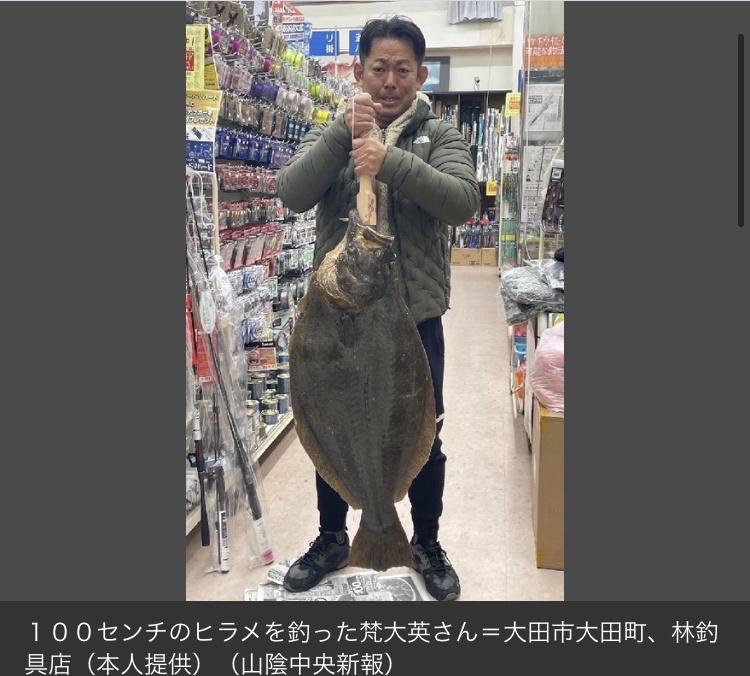 島根県大田市静間町の和江漁港で、100センチのヒラメが釣れた。林釣具店(大田市大田町)によると、