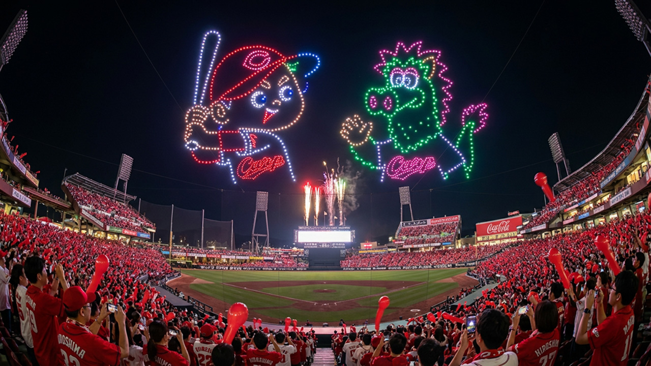 ■マツダスタジアムのバックスクリーン下に大量のドローンが到着→試合前や試合後に練習している様子が目撃される